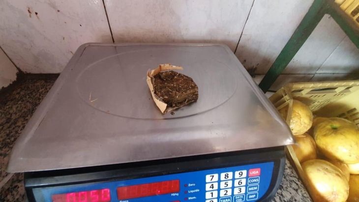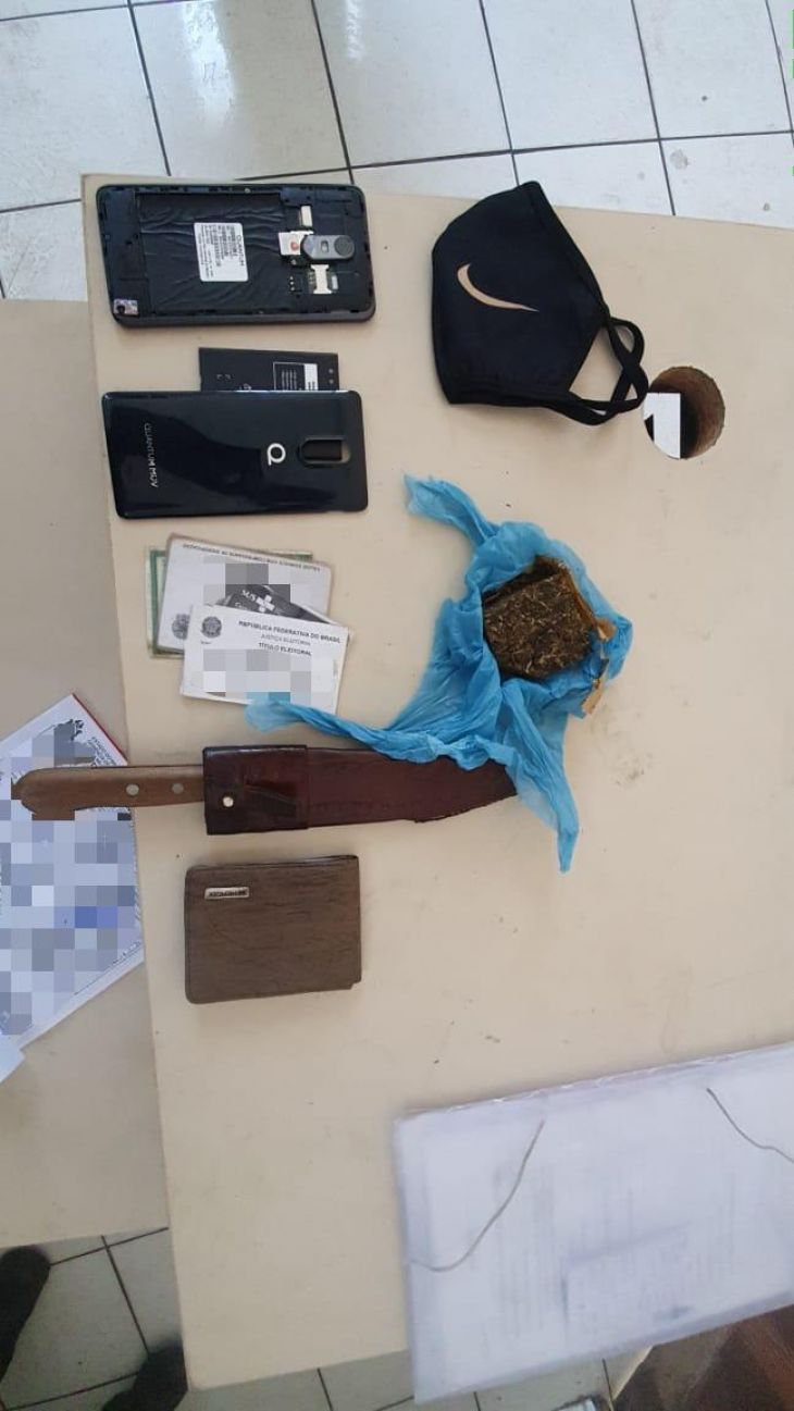 Os policiais faziam rondas no bairro Teso Duro quando avistaram o trio na 6ª Travessa da Pedreira. Foram apreendidas durante a abordagem e revista pessoal 50 gramas de maconha prensada e uma faca com bainha.
