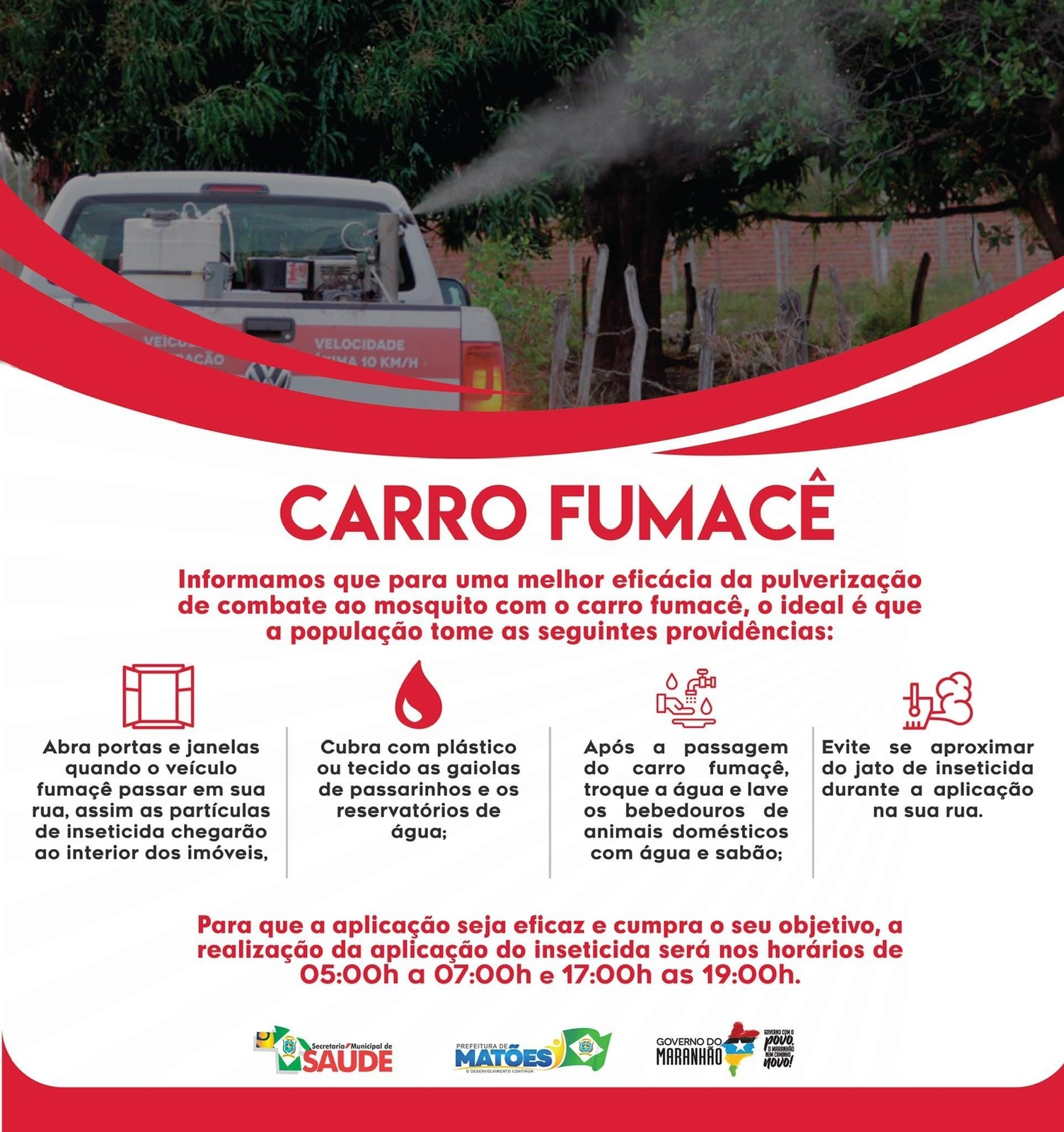 Fique atento matoense. A prefeitura de Matões, por meio da Secretaria de Saúde do Município, em cooperação com o Governo do Estado e a Regional de Saúde, disponibilizará o carro Fumacê a partir desta sexta-feira (6).