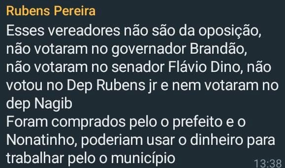 Está rolando em grupos de WhatsApp da cidade Matões um print em que o ex-deputado e atual secretário de articulação política do Estado Rubens Pereira faz acusações seríssimas, que até pode ser penalizado.
