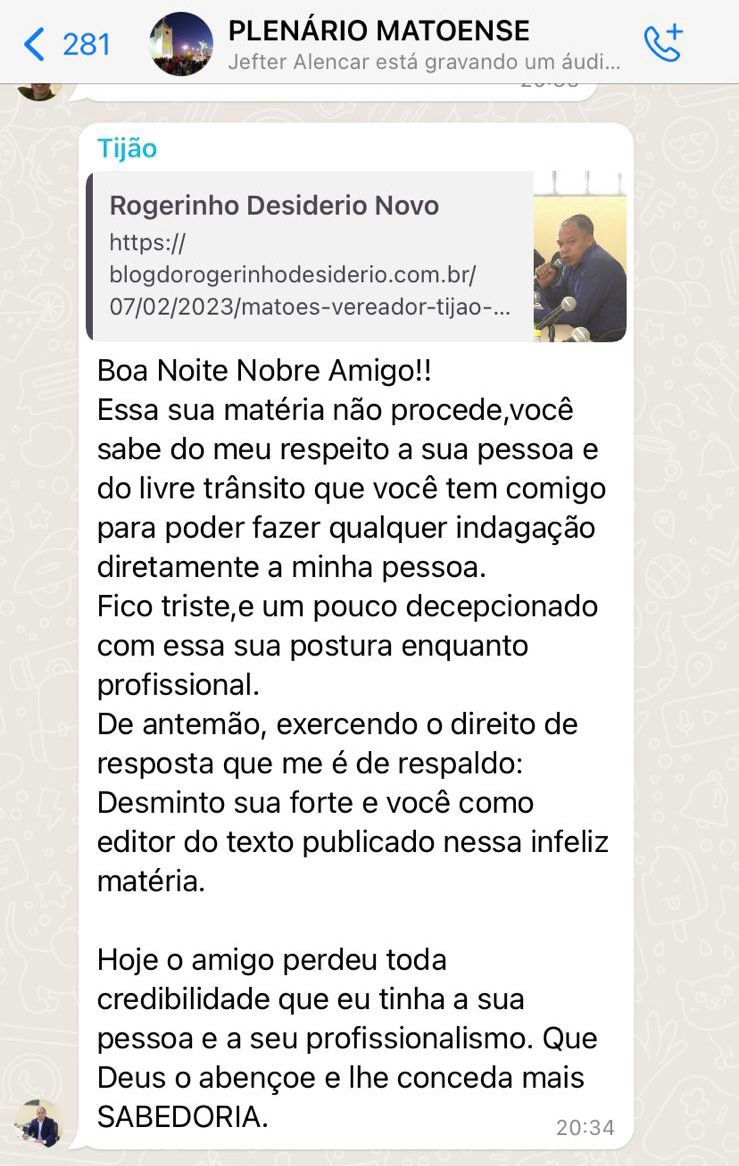 "Boa Noite Nobre Amigo,Essa sua matéria não procede,você sabe do meu respeito a sua pessoa e do livre trânsito que você tem comigo para poder fazer qualquer indagação diretamente a minha pessoa. Fico triste, e um pouco decepcionado com essa sua postura enquanto profissional. De antemão, exercendo o direito de resposta que me é de respaldo: Desminto sua forte e você como editor do texto publicado nessa infeliz matéria. Hoje o amigo perdeu toda credibilidade que eu tinha a sua pessoa e a seu profissionalismo. Que Deus o abençoe e lhe conceda mais SABEDORIA" disse o vereador Tijão