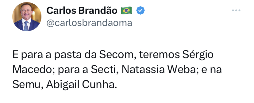 “Estamos felizes pelo honroso convite do nosso governador. Quem ganha é o Maranhão com essa grande mulher, Abigail Cunha, no comando da Secretaria da Mulher.” disse Rigo Teles