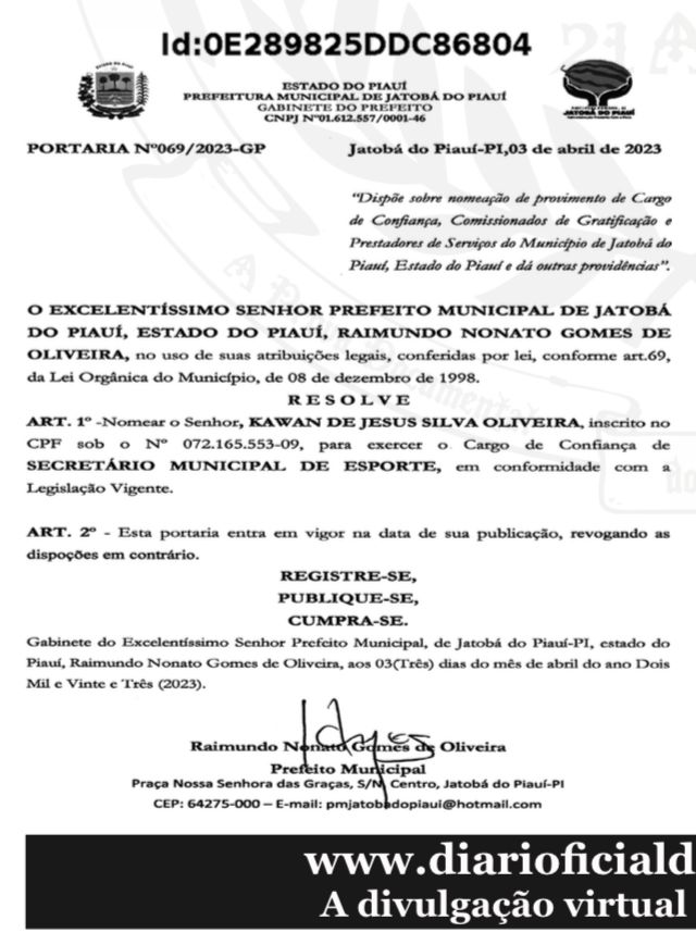 O contrato entre a Prefeitura de Jatobá do Piauí e a Kace Comércio foi assinado pelo prefeito Hilton Gomes e publicado no Diário Oficial dos Municípios no dia 16 de maio. Um mês após a nomeação do filho da empresária para o cargo de secretário de Esportes.