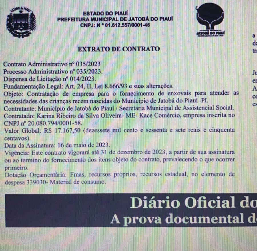 O prefeito Hilton Gomes, de Jatobá do Piauí, contratou sem licitação a empresa Karina Ribeiro da Silva Oliveira-ME, como nome fantasia Kace Comércio para o fornecimento de enxovais durante o ano de 2023.