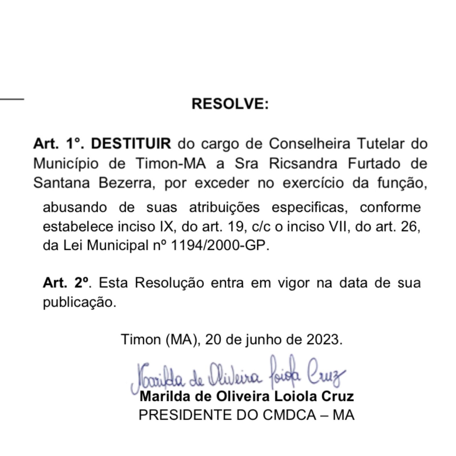 Na última quinta-feira (29) a Prefeitura de Timon através do Diário Oficial do município, informou a destituição de uma conselheira tutelar, identificada como, Ricsandra Furtado Santana, por exceder no exercício de suas funções. A prefeitura municipal tomou essa decisão após receber denúncias e realizar uma investigação interna.