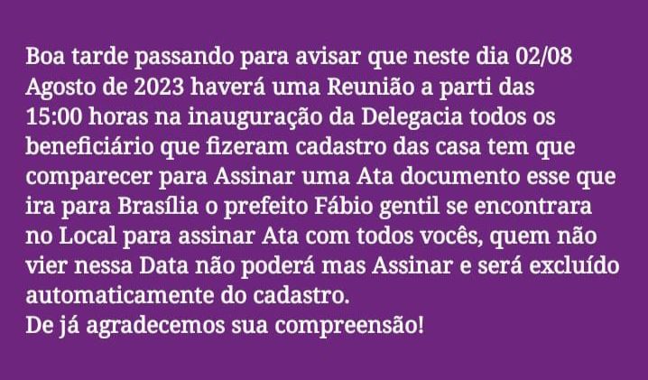 A postagem polêmica deixa claro que quem não comparecer à inauguração será automaticamente excluído sem dó nem piedade do cadastro do programa de moradias populares.