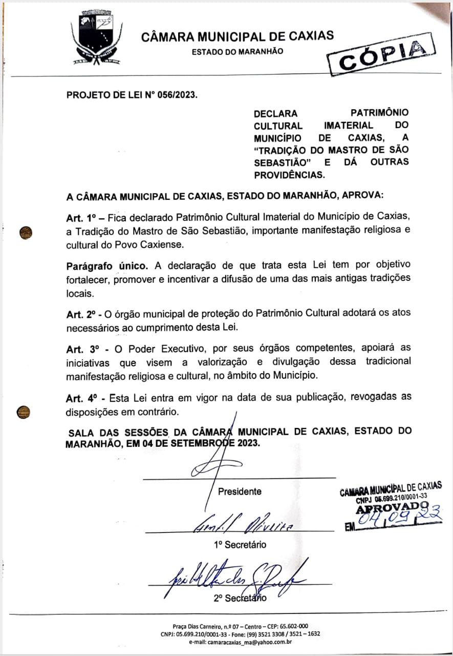 Foi aprovado no dia 04 de setembro de 2023 na sessão ordinária da Câmara de Vereadores de Caxias, o projeto de Lei que declara patrimônio cultural imaterial do município de Caxias, a “Tradição religiosa do mastro de São Sebastião”. Essa festa é organizada pela família Assunção há muitos anos atrás e segue a tradição em comemoração ao glorioso São Sebastião.