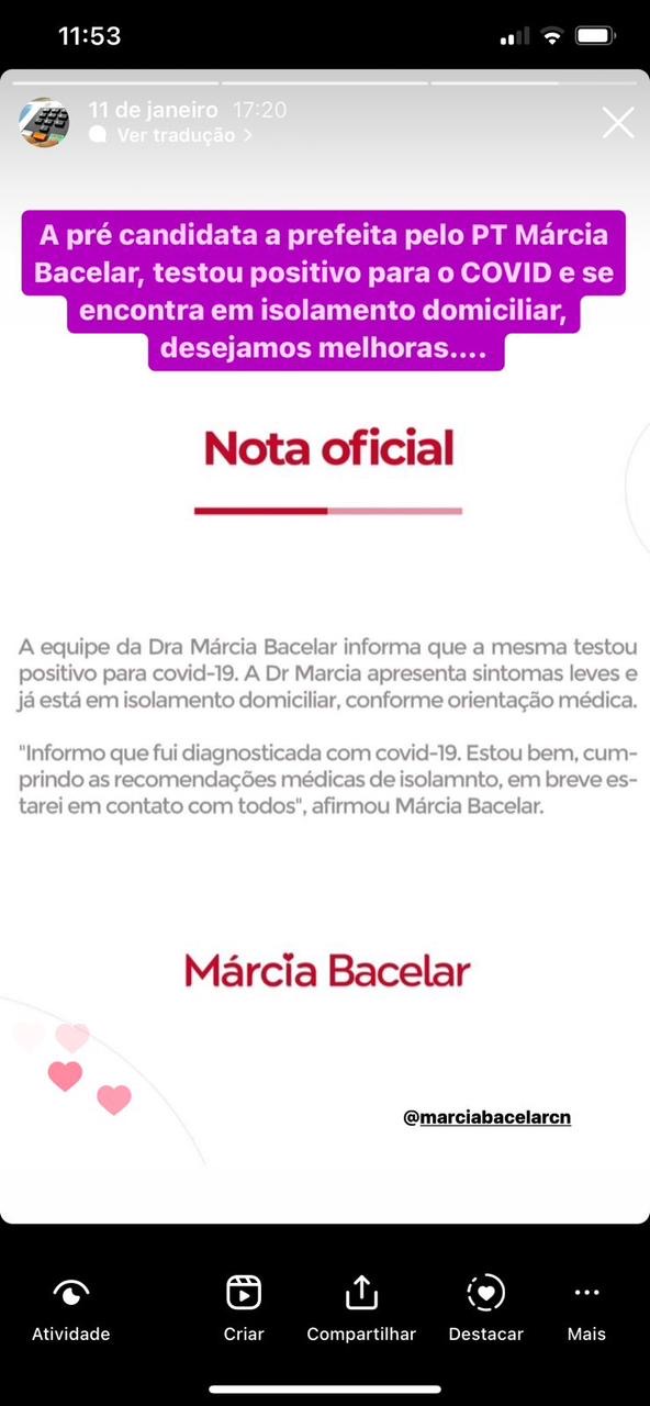 Pela nota, a ex-prefeita havia testado positivo, estava com sintomas leves e em isolamento domiciliar, cumprindo orientação médica.