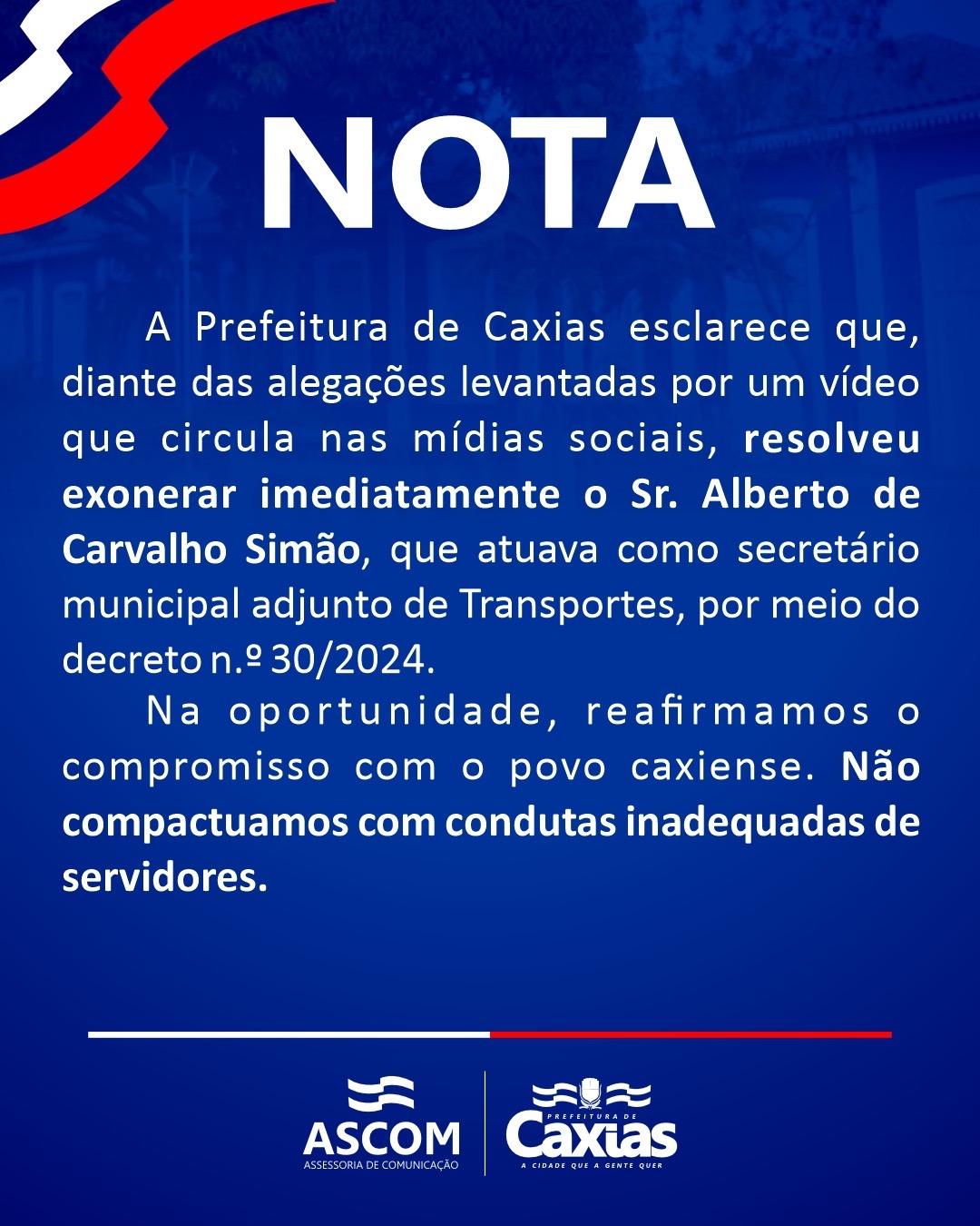 Diante desse episódio, a prefeitura reitera o compromisso com o povo caxiense e que não compactua com condutas inadequadas de servidores.