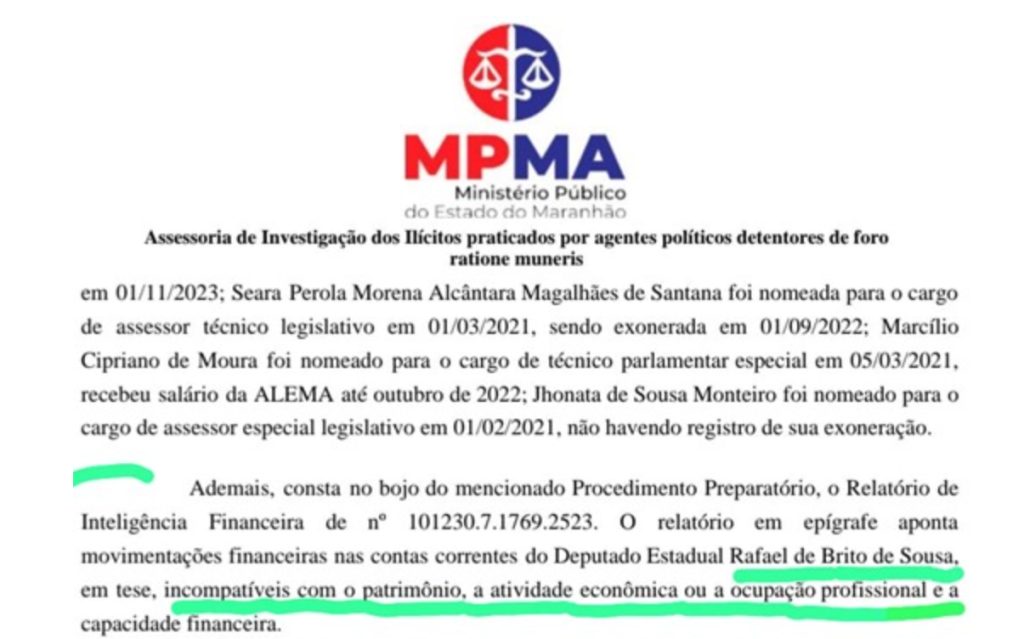 Um relatório emitido pelo Ministério Público no final de março ressaltou a necessidade de investigar as movimentações financeiras nas contas de Rafael de Brito de Sousa, apontando que essas transações eram, em princípio, incompatíveis com seu patrimônio, atividade econômica, ocupação profissional e capacidade financeira.