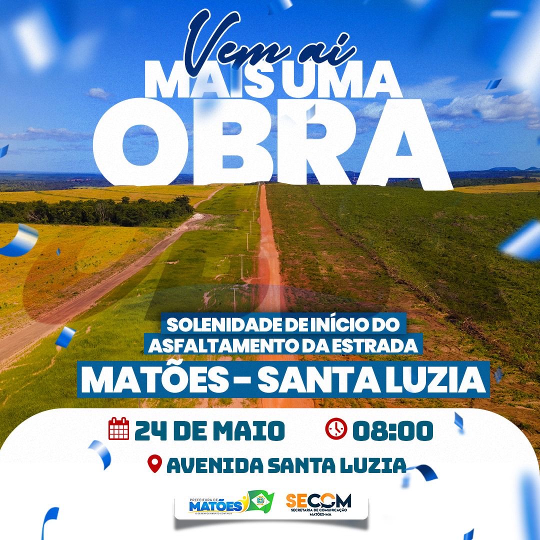 Nesta sexta-feira, dia 24, às 8h, a prefeitura de Matões irá realizar a solenidade de inicio do asfaltamento da estrada que liga o m até o povoado Santa Luzia.