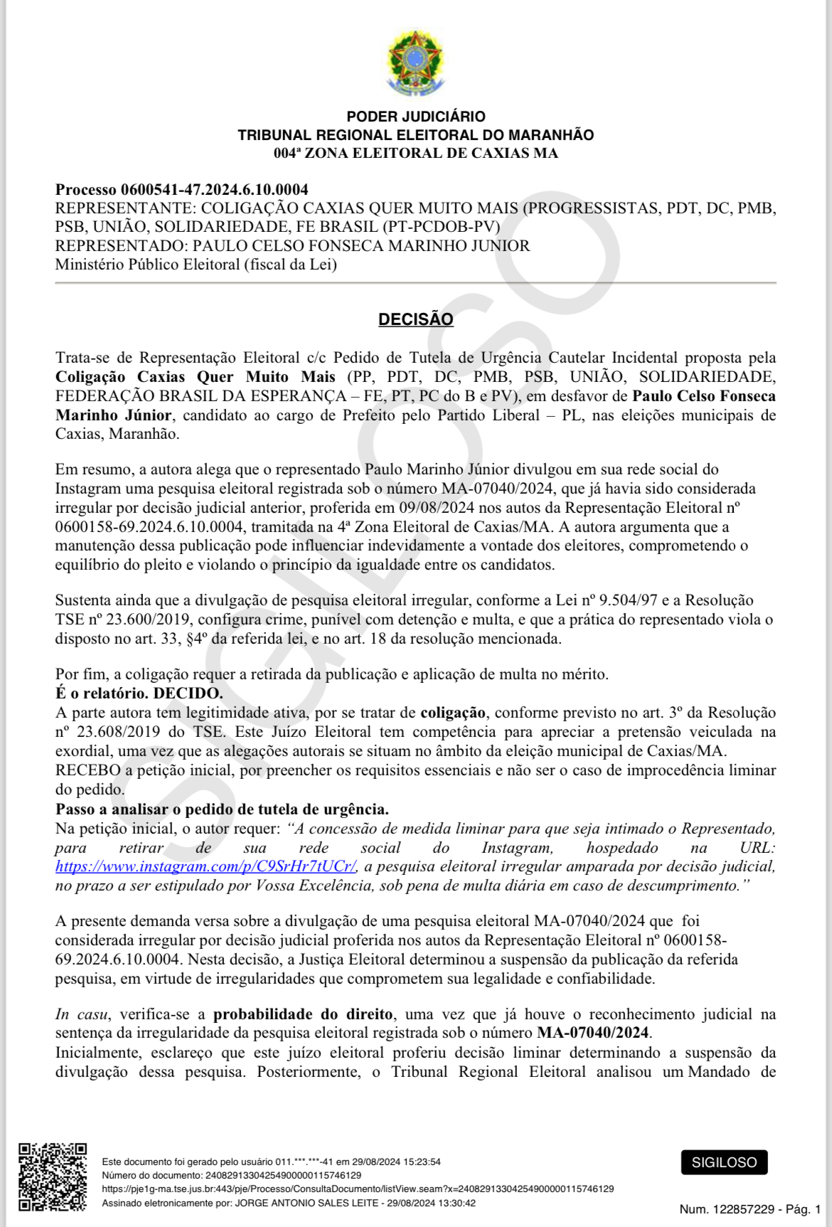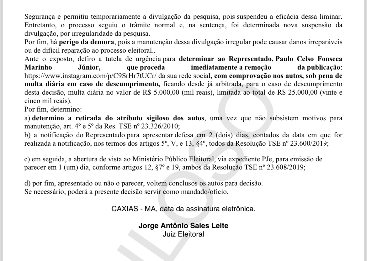 O juiz Jorge Sales proferiu uma nova condenação, determinando a remoção imediata da pesquisa falsa de todas as plataformas de redes sociais. Além disso, foi imposta uma multa diária de R$ 5 mil por cada dia em que a pesquisa permanecer online, reforçando o compromisso da Justiça com a integridade das informações eleitorais.