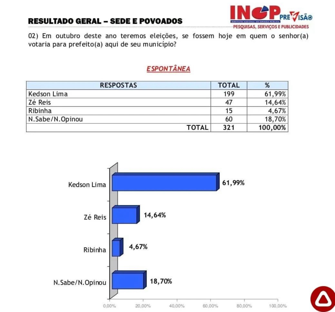 A mais recente pesquisa realizada pela INOP Previsão revela que o atual prefeito e candidato à reeleição, Kedson Lima (PL), é o favorito para as eleições municipais de 2024 em Aldeias Altas.