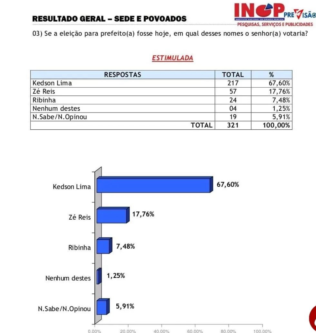 No cenário estimulado, quando são apresentados os nomes dos candidatos, Kedson Lima ampliou sua vantagem, chegando a 67,60%, seguido novamente por Zé Reis, com 17,76%, e Ribinha do Zé da Rede, que obteve 7,48%.