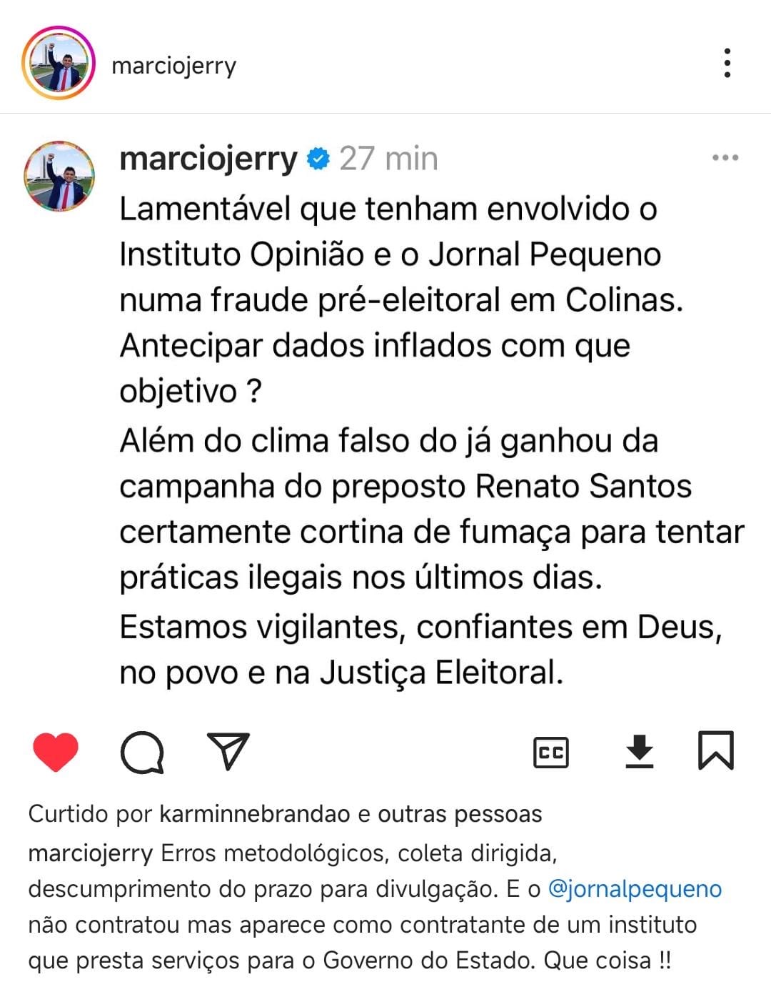 A situação se agravou nesta terça-feira (01), quando o deputado federal e aliado de Rubens Pereira Junior, aliado de Gabriel em Matões, fez uma postagem em suas redes sociais, acusando o Instituto Opinião de fraudes eleitorais. Segundo ele, a divulgação dos dados antes do prazo legal, além de erros metodológicos e uma coleta de dados direcionada, comprometeu a integridade da pesquisa.