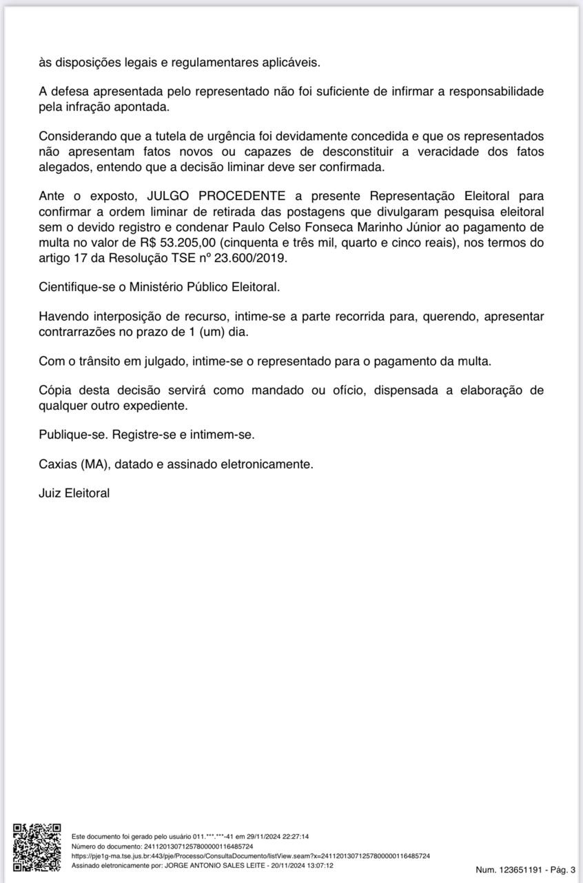 Em mais uma condenação do candidato derrotado Paulo Marinho Jr., a Justiça Eleitoral de Caxias impôs uma multa de R$ 53.205,00 (cinquenta e três mil, duzentos e cinco reais) devido à divulgação de uma pesquisa eleitoral irregular. A sentença foi proferida após uma representação movida pela Coligação Caxias Quer Muito Mais.