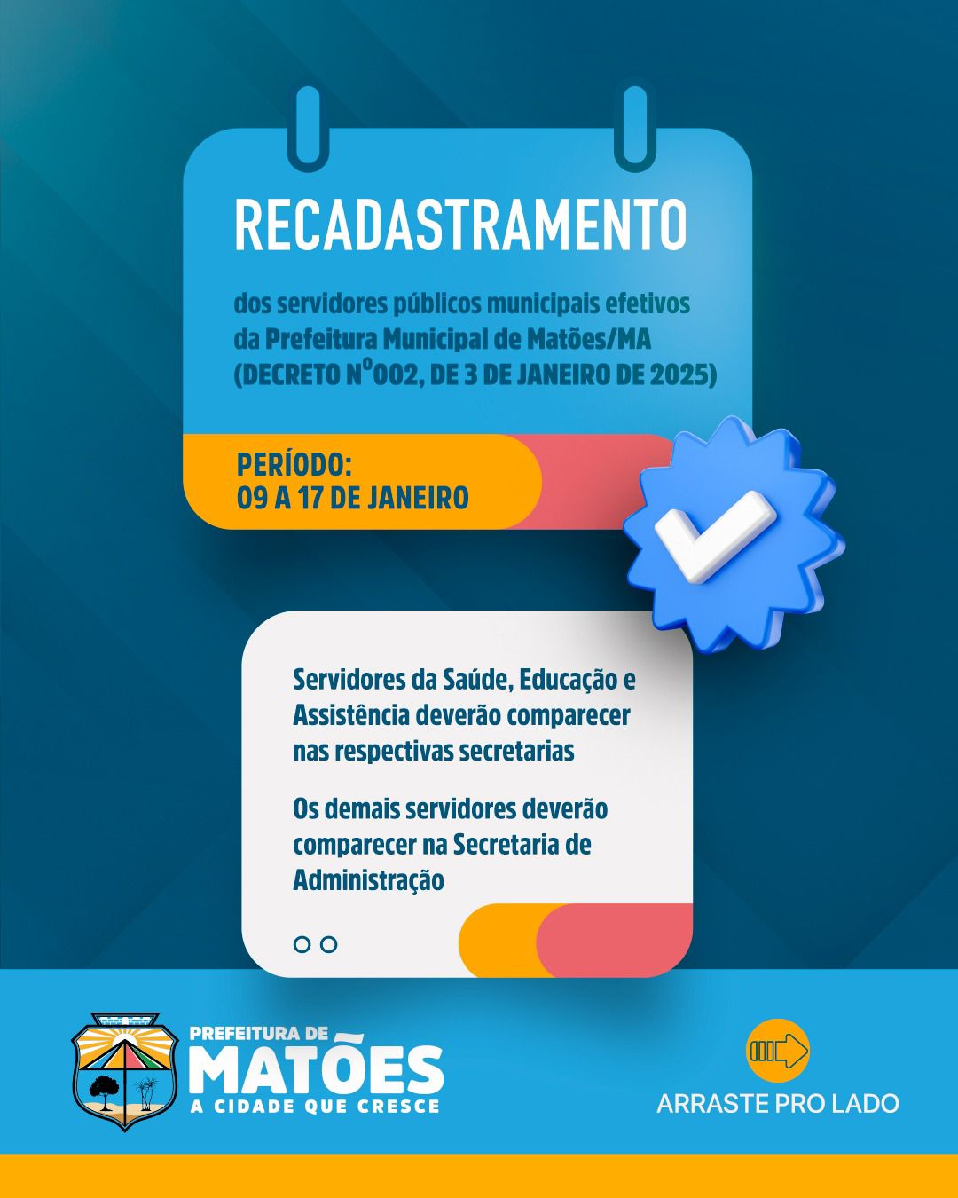 A Prefeitura Municipal de Matões informa que o Recadastramento dos Servidores Públicos Municipais Efetivos será realizado de 09 a 17 de janeiro.