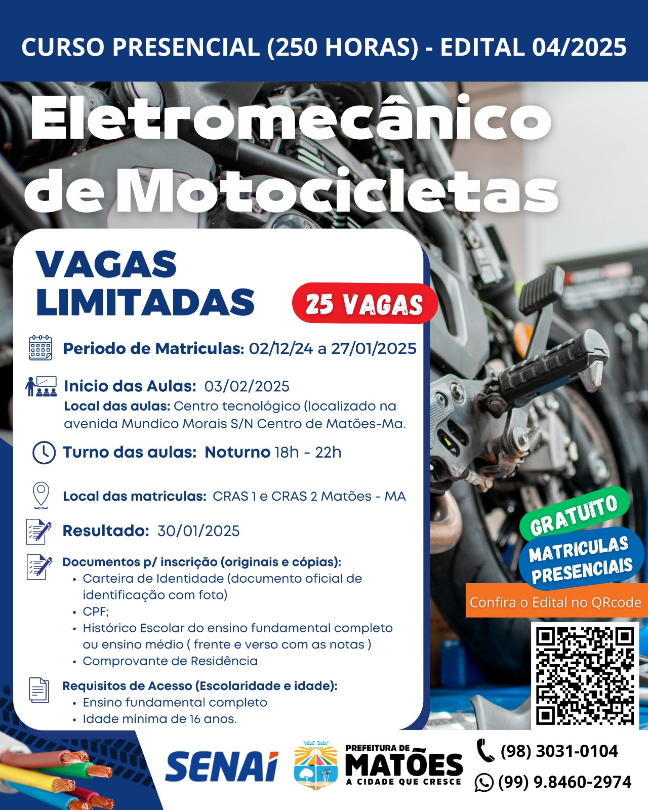 O curso de eletromecânico de motocicletas visa capacitar trabalhadores para o mercado de trabalho eletromecânica do Município de Matões.