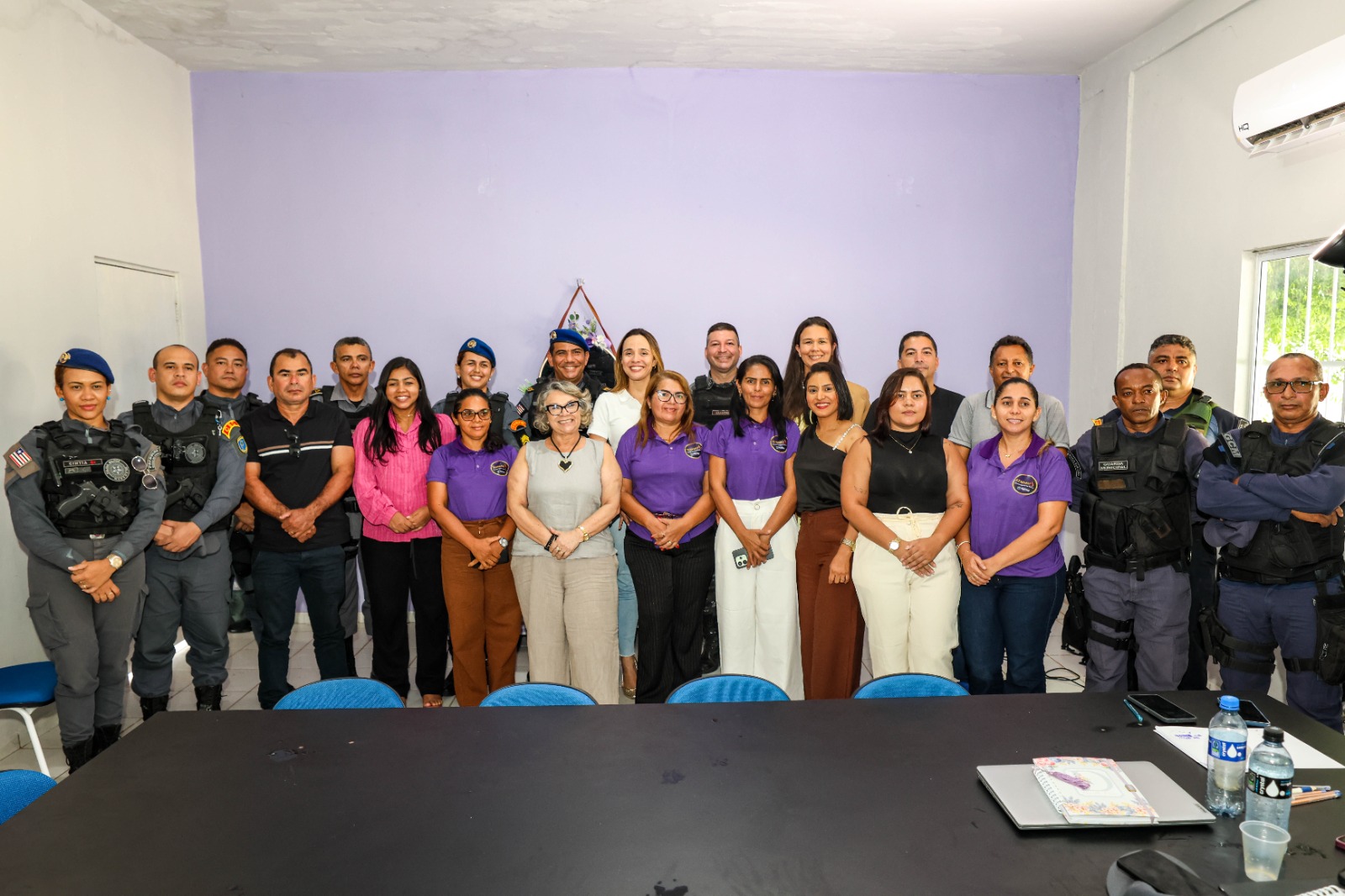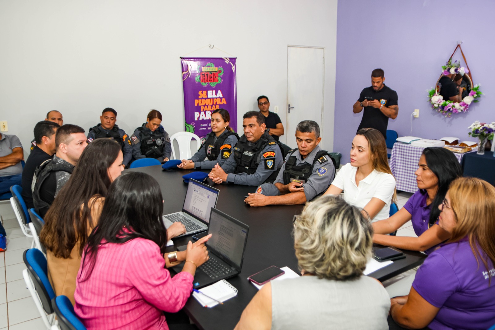 Participaram da reunião a secretária da Mulher, Teresa, e a secretária adjunta Ilma; a vice-prefeita Christiane Pinheiro; o presidente da Câmara Municipal, vereador Thyago Brito; o comandante do 11º Batalhão de Polícia Militar, Coronel Kraieski; a comandante da Patrulha Maria da Penha, Sargento Emanuelle; e o Coronel Sousa, comandante Estadual da Patrulha Maria da Penha.