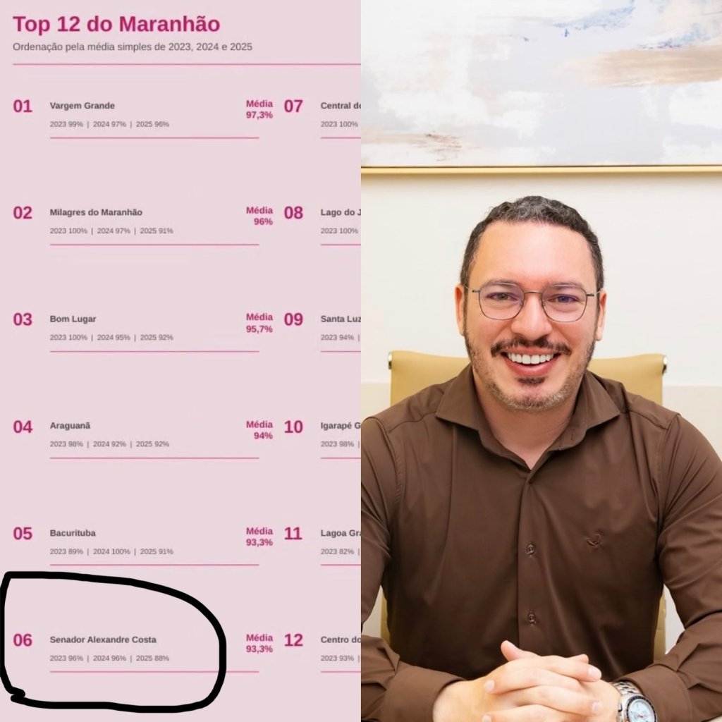 Entre os destaques do ranking está o município de Senador Alexandre Costa, que aparece na 6ª colocação, evidenciando um desempenho consistente e avanços importantes na alfabetização na idade certa.